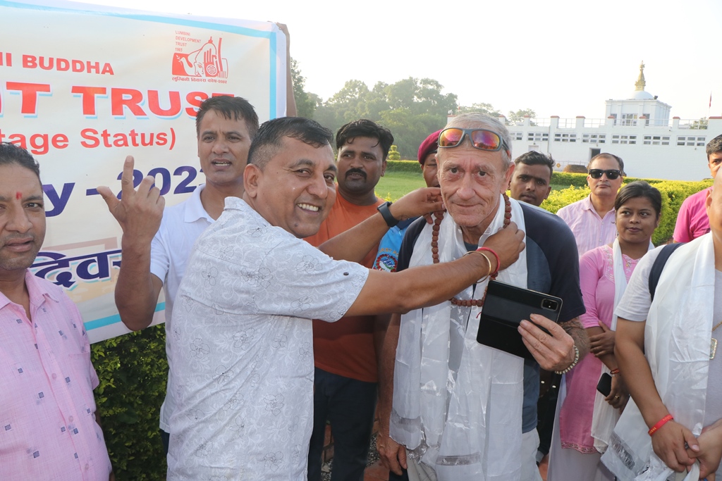 लुम्बिनी विकास कोष र पर्यटन व्यवसायीहरुले ४४ औँ विश्व पर्यटन दिवसका अवसरमा बुधबार बुद्वजन्मस्थल लुम्बिनी आएका पर्यटकहरुलाइ स्वागत गरेको छ
